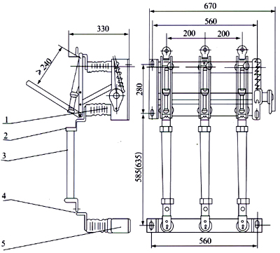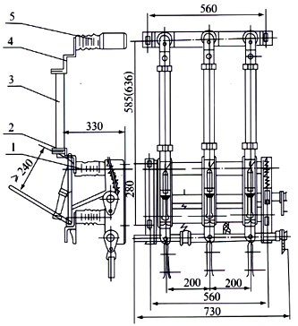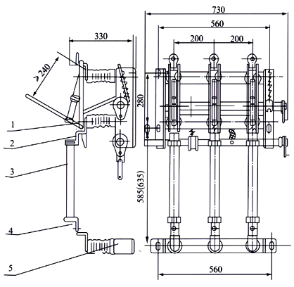 1、FN5-12負荷開關 2、支座熔斷器接線板 3、熔管 4、熔斷器接線板 5、熔斷器支架 注:配RN3熔管電流75A及75A以上的安裝尺寸為括號內尺寸。 |