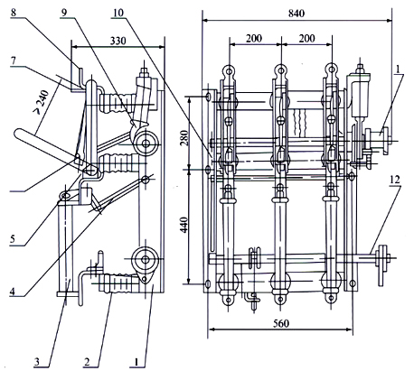 1、框架 2、支柱絕緣子 3、支座接線座 4、刀片 5、滅弧管 6、扭簧及扭簧銷軸 7、導向片 8、觸座接線板 9、拉桿 10、負荷開關轉軸 11、彈簧儲能機構 12、操作機構 |