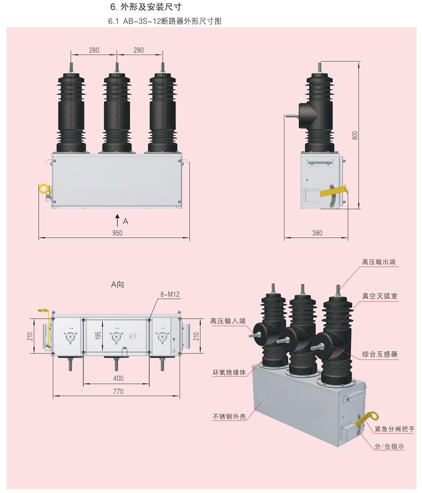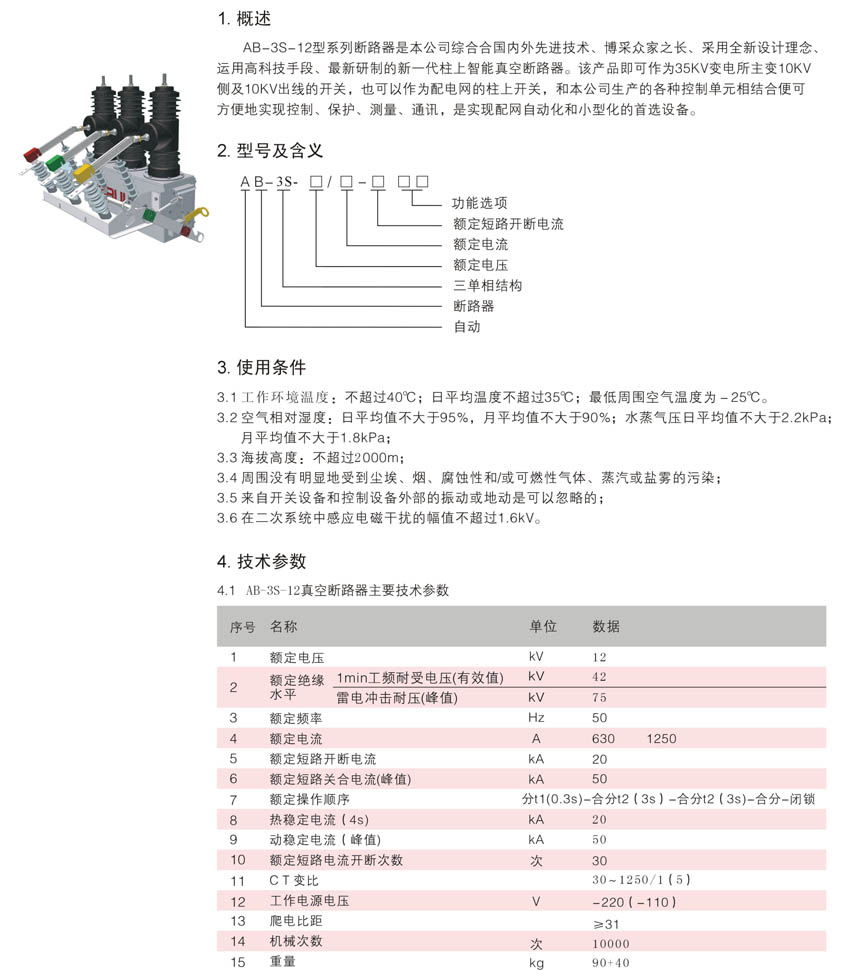 AB-3S-12系列戶外高壓真空永磁斷路器是本公司綜合國內外先進技術、博采眾家之長、采用全新設計理念、運用高科技手段、最新研制的新一代柱上真空斷路器。該產品既可作為35kV變電所主變10kV側及10kV出線的開關,也可作為配電網的柱上開關,和本公司生產的控制器相結合便可方便地實現控制、保護、測量、通訊,是實現配網自動化和小型化變電所的首選設備。