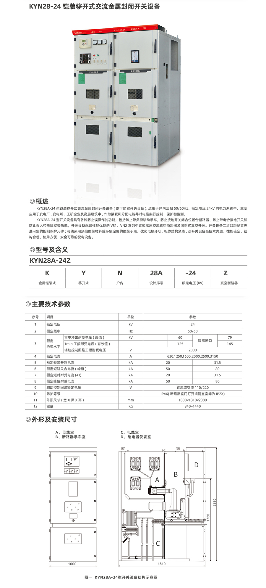 KYN28A-24(SDK1-24)型鎧裝移開式交流金屬封閉開關設備(以下簡稱開關設備),適用于戶內三相50/60HZ、額定電壓24kV 的電力系統中,主要應用于發電廠,變電所、工礦企業及高層建筑中,作為接受和分配電能并對電路實行控制、保護和監測。