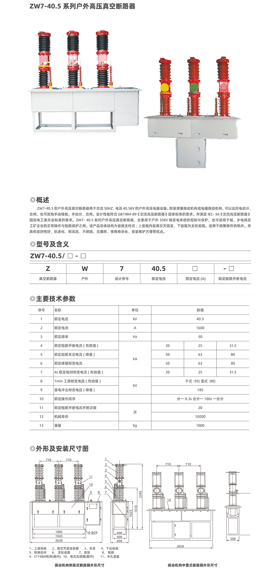 ZW7-40.5型 戶 外 高 壓 真 空 斷 路 器 用 于 交 流 50Hz、 額 定 電 壓 40.5KV的戶外高壓電氣設(shè)備。附裝彈簧操動(dòng)結(jié)構(gòu)或電磁操動(dòng)結(jié)構(gòu),可 以遠(yuǎn)控電動(dòng)分、合閘,也可就地手動(dòng)儲(chǔ)能,手動(dòng)分、合閘。設(shè)計(jì)性能 符合GB1984-2014《交流高壓斷路器》國(guó)家標(biāo)準(zhǔn)的要求。并滿足IEC- 56《交流高壓斷路器》國(guó)際電工委員會(huì)標(biāo)準(zhǔn)的要求。ZW7-40.5系列戶外高壓真空斷路器,主要用于戶外35KV輸變電系統(tǒng)的控制與保護(hù),也 可適用于城、鄉(xiāng)電網(wǎng)及工礦企業(yè)的正常操作與短路保護(hù)之用。該產(chǎn)品 總體結(jié)構(gòu)為瓷瓶支柱式;上瓷瓶?jī)?nèi)裝真空滅弧室,下瓷瓶為支柱瓷 瓶。適用于頻繁操作的場(chǎng)所。并具有密封性好、抗老化、耐高壓、不燃燒、無爆炸、使用壽命長(zhǎng)、安裝維護(hù)方便等優(yōu)點(diǎn)。