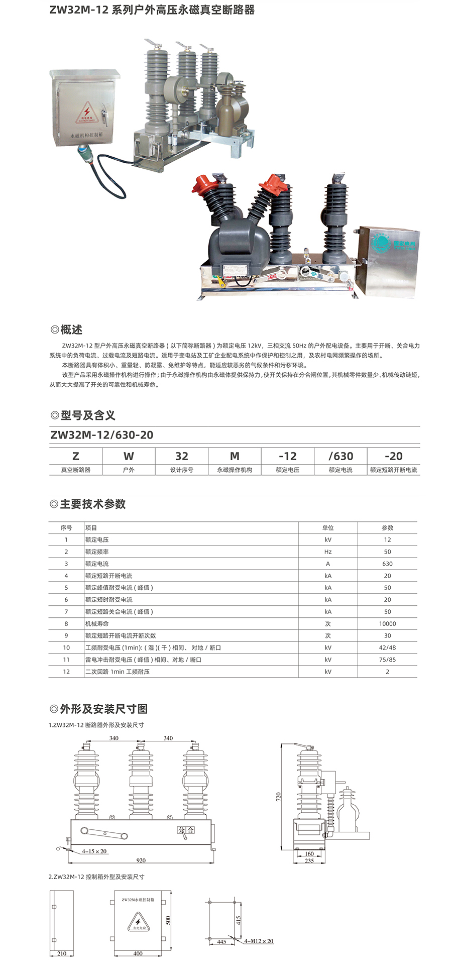 ZW32M(T)-12型戶外高壓交流真空斷路器采用真空滅弧原理、永磁操動機構(彈操機構),集成微處理技術、現代網絡通訊技術和開關制造材料于一體。額定電壓為12kV,50Hz三相交流的戶外配電設備。該產品廣泛適用于城市電網中作為分斷或聯絡開關,或用于農網配電系統。戶外變電站出線開關,可有效完成傳統的重合器的工作,分、合負荷電流和短路電流。