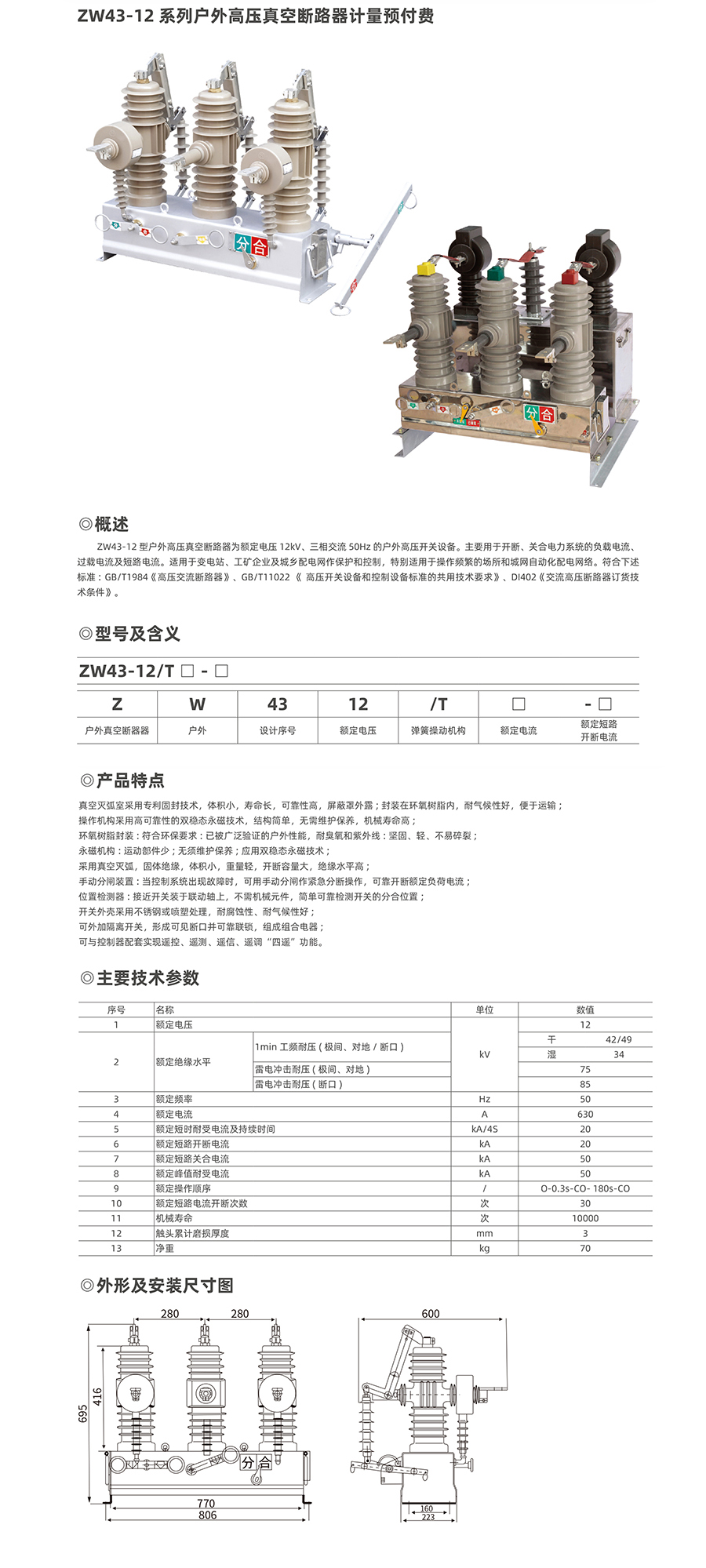 ZW43-12系列戶外高壓真空斷路器計量預付費
