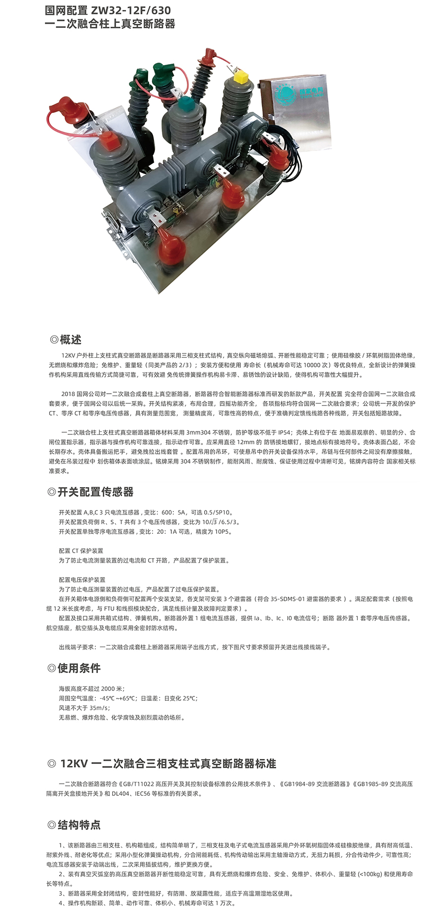 ZW32H-12F型一二次融合柱上成套真空開關(guān),戶外高壓交流真空斷路器采用真空滅弧原理、永磁操動機構(gòu)(彈操機構(gòu)),集成微處理技術(shù)、現(xiàn)代網(wǎng)絡(luò)通訊技術(shù)和新型開關(guān)制造材料于一體。額定電壓為12kV,50Hz三相交流的戶外配電設(shè)備。該產(chǎn)品廣泛適用于城市電網(wǎng)中作為分?jǐn)嗷蚵?lián)絡(luò)開關(guān),或用于農(nóng)網(wǎng)配電系統(tǒng)。戶外變電站出線開關(guān),可有效完成傳統(tǒng)的重合器的工作,分、合負(fù)荷電流和短路電流。