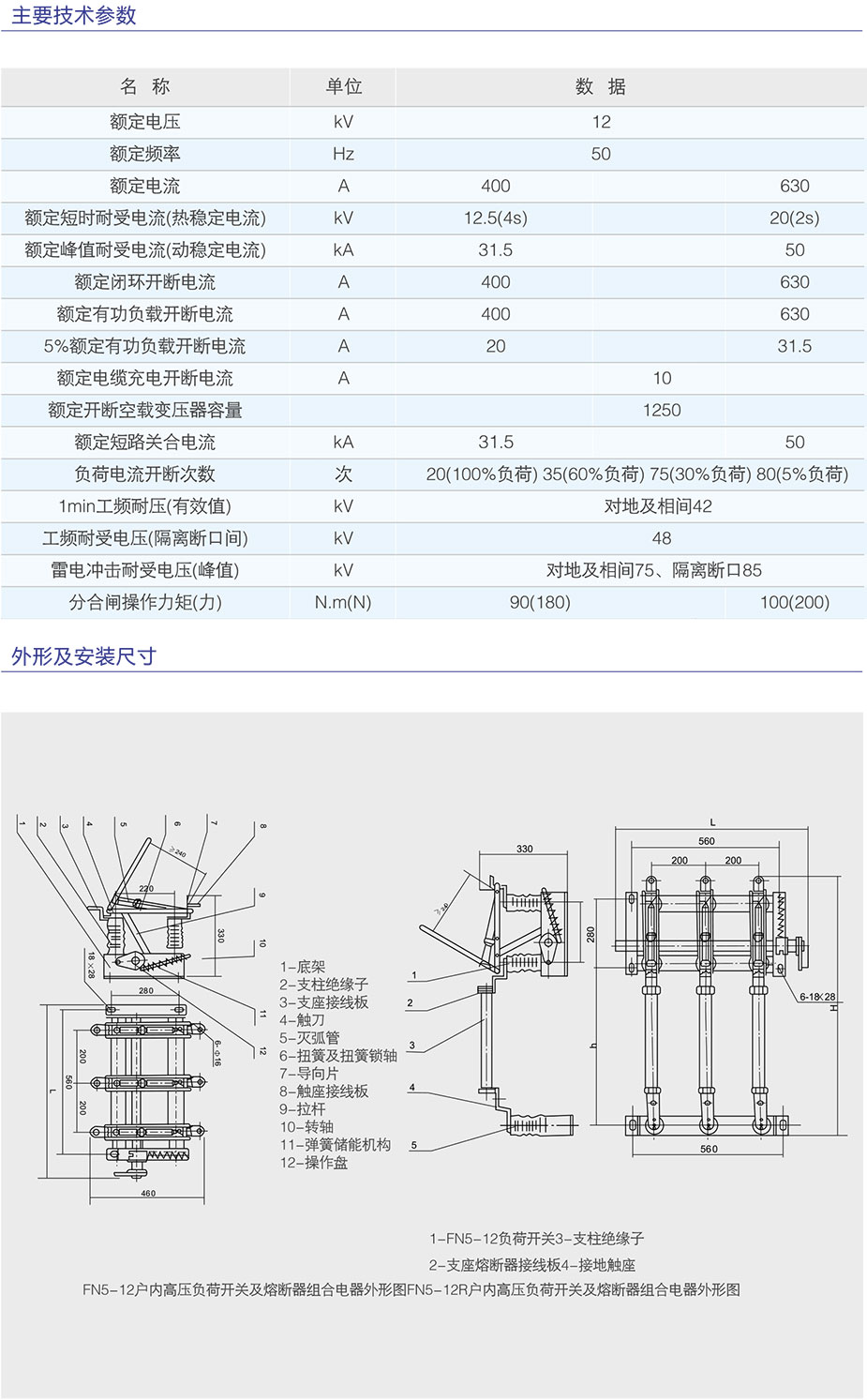 FN5-12RD/630戶內交流高壓負荷開關(以下簡稱負荷開關適用于交流50Hz、12kV的網絡中,作為開斷負荷電流及關合短路電流之用。帶有熔斷器的負荷開關可切斷短路電流,作保護開關之用。本負荷開關可配用CS6-1型手動操作機構、本產品專用CS□手動操作機構或CJ□電動操動機構。