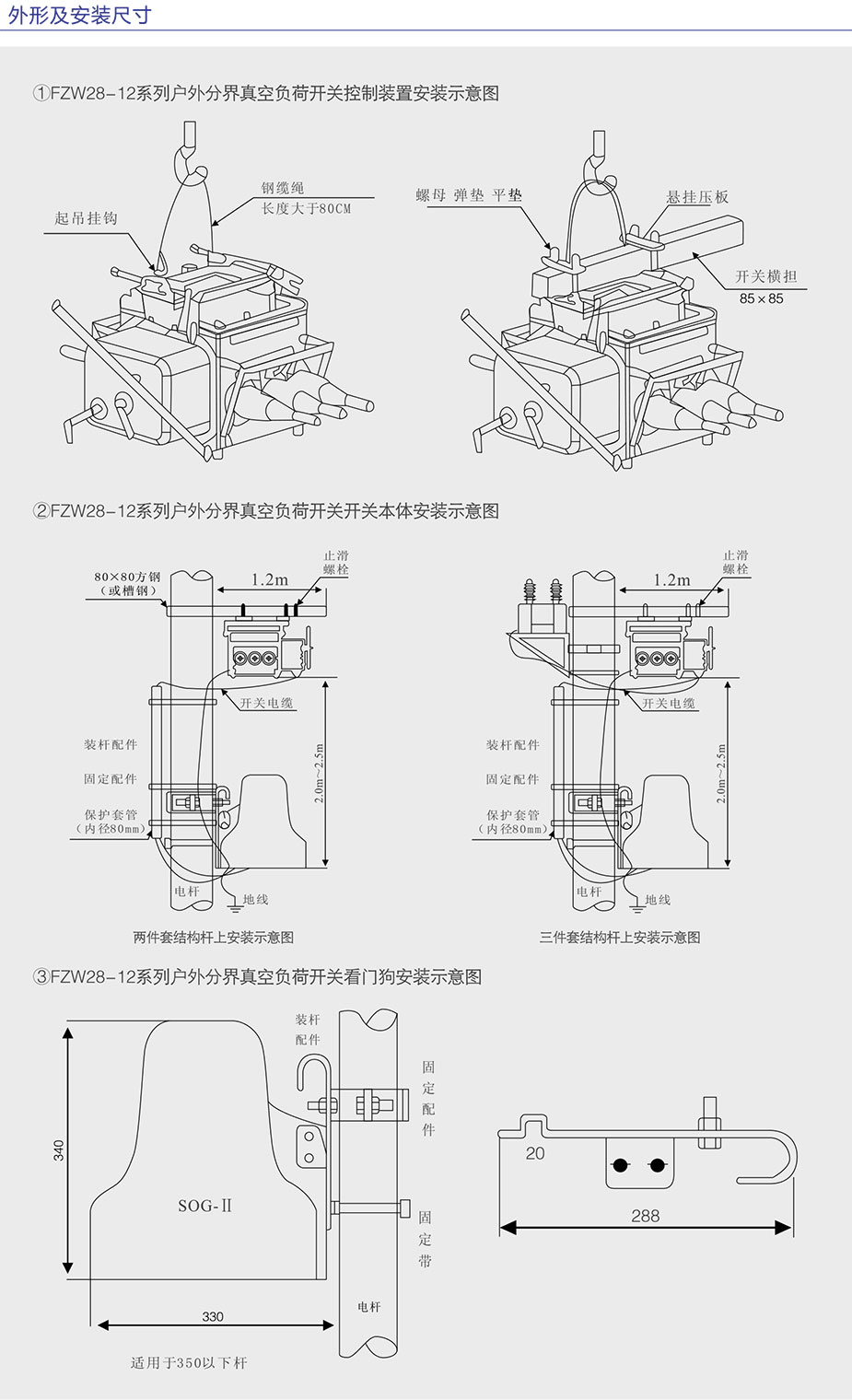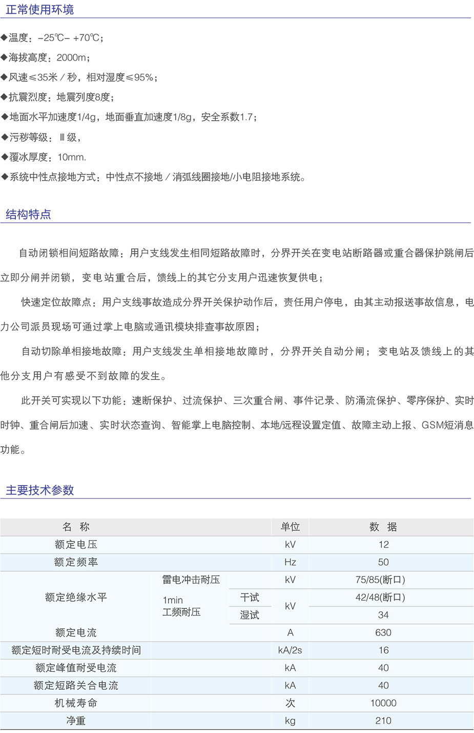 FZW28(A)-12F型戶(hù)外分界真空負(fù)荷開(kāi)關(guān)使用于柱上安裝的場(chǎng)合,具有手動(dòng)和電動(dòng)操作功能。開(kāi)關(guān)本體采用引進(jìn)日本東芝公司VSP5-12,本開(kāi)關(guān)為免維護(hù)負(fù)荷開(kāi)關(guān)。采用真空滅弧和SF6氣體作對(duì)地及相間絕緣介質(zhì)。本產(chǎn)品符合:GB3804《高壓交流負(fù)荷開(kāi)關(guān)》及GBT11022《高壓開(kāi)關(guān)設(shè)備和控制設(shè)備標(biāo)準(zhǔn)的共用技術(shù)要求》。本說(shuō)明描述了柱上真空負(fù)荷開(kāi)關(guān)的結(jié)構(gòu)、功能和組裝方法。 FZW28(A)-12F型戶(hù)外分界真空負(fù)荷開(kāi)關(guān)(VSP5-12開(kāi)關(guān)本體與FDR-01控制器)具備故障檢測(cè)功能,保護(hù)控制功能和通訊功能,安裝于10KV架空線(xiàn)路上,可實(shí)現(xiàn)自動(dòng)切除單相接地故障和自動(dòng)隔離相間短路故障。安裝點(diǎn)適用于10KV配電線(xiàn)路用戶(hù)進(jìn)線(xiàn)的責(zé)任分界點(diǎn)處,也可以適用于符合要求的分支線(xiàn)連接處。 該智能負(fù)荷開(kāi)關(guān)具備SOG功能。