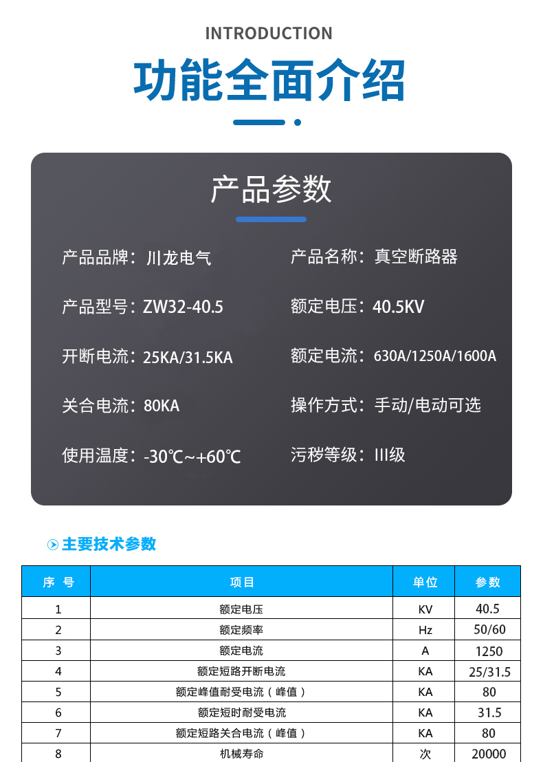 ZW32-40.5型戶外高壓真空斷路器采用了獨(dú)特設(shè)計(jì)的一體式固封極柱和高可靠性的操作機(jī)構(gòu)。ZW32-40.5真空斷路器是浙江川龍電氣有限公司研發(fā)改進(jìn)的并可以代替ZW7-40.5真空斷路器用于柱上安裝的智能真空斷路器。該裝置主要應(yīng)用于中壓架空線電網(wǎng),作為分、合負(fù)荷電流、過(guò)載電流、短路電流之用。